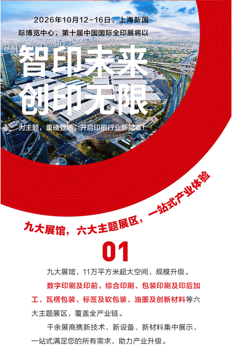 2026年10月12-16日,第十届中国国际全印展将在上海新国际博览中心盛大开幕。这场以"智印未来 创印无限"为主题的行业盛会,将汇聚全球印刷行业精英,共同探索印刷业数字化转型的新征程。